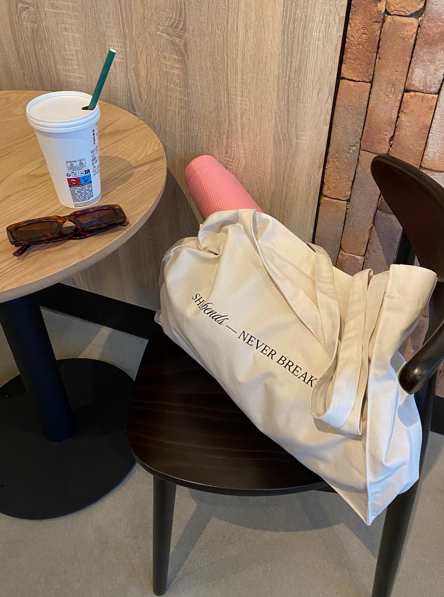 "She Bends - Never Breaks" certified sustainable shopping bag, made to last and be your go-to bag where you want to carry all your treasures in. This durable spacious big bag with long straps is suitable for any occasion such as grocery shopping, beach day, from long day at work to the gym or for a weekend get away!